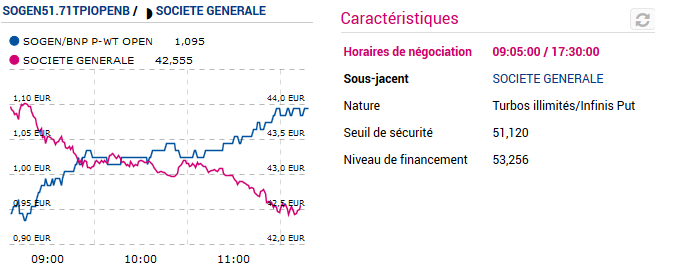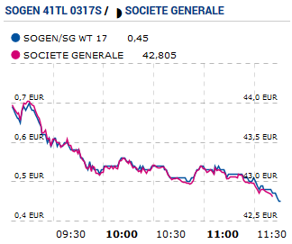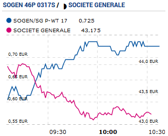 Regardez ce graphique, il compare le cours de l’action Société Générale (en rose) et d’un warrant associé (en bleu) le 10 février 2017.